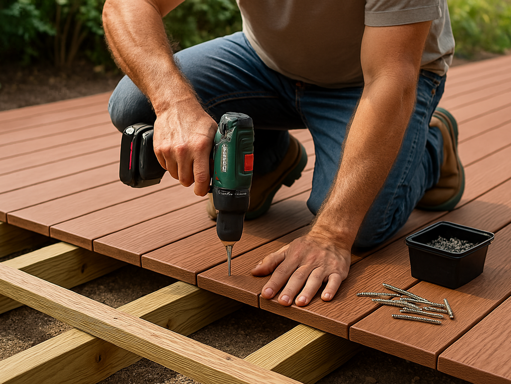 Secure the wooden planks or composite boards onto the frame, ensuring proper spacing for expansion and drainage.